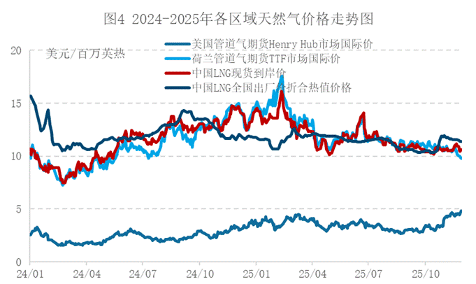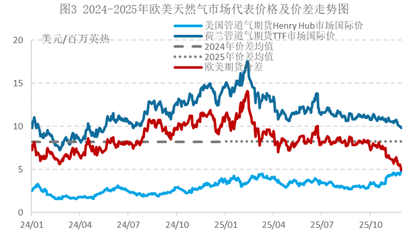 11月,美国本土天然气产量与库存持续保持高位水平,但在季节性取暖需求及创纪录的LNG出口双重拉动下,天然气期货月均价实现同环比显著上涨;欧洲市场则因供应充裕、需求温和及地缘情绪缓和,价格震荡下行。进入12月,强劲的出口将继续为美国价格提供托底,预计价格将偏强运行,而欧洲市场则面临温暖天气等多重利空考验,预计价格重心仍存下行压力。
