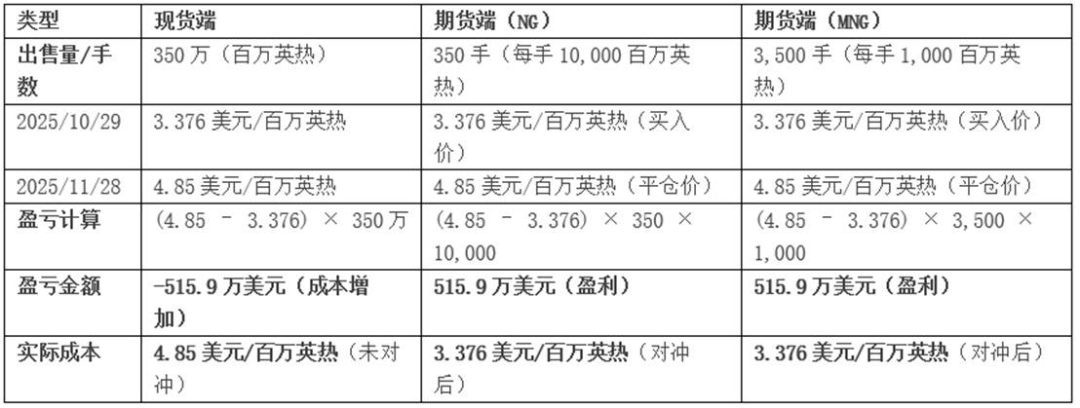 完全对冲效果:现货额外成本被期货盈利抵消,实际成本仍为3.376美元/百万英热。