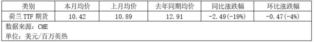 11月欧洲天然气期货价格震荡下跌,期间曾有短暂反弹,但对月均价影响较小,月均价同环比皆呈下跌走势。
